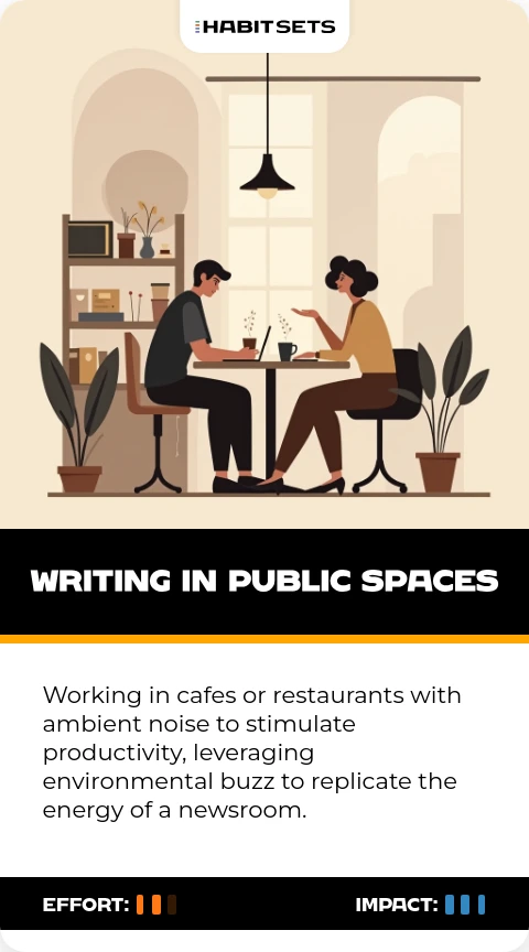 Working in cafes or restaurants with ambient noise to stimulate productivity, leveraging environmental buzz to replicate the energy of a newsroom.