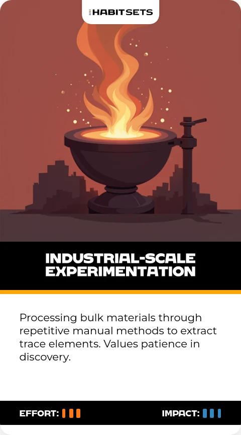 Marie Curie processed tons of pitchblende to isolate 0.1g radium chloride. This habit of industrial-scale lab work proved radioactive elements' existence despite skepticism.