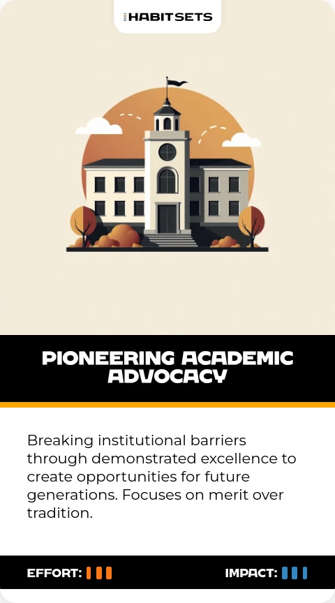 Breaking institutional barriers through demonstrated excellence to create opportunities for future generations. Focuses on merit over tradition.