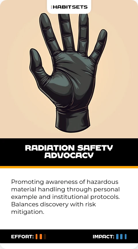Though initially unaware of radiation dangers, Marie Curie later championed safety measures after observing health impacts. This habit demonstrated her commitment to responsible scientific progress despite personal cost.
