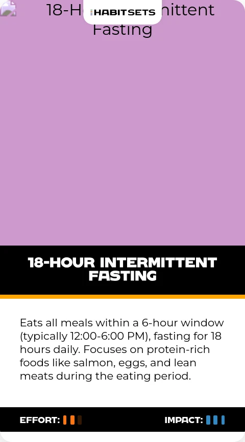 Eats all meals within a 6-hour window (typically 12:00-6:00 PM), fasting for 18 hours daily. Focuses on protein-rich foods like salmon, eggs, and lean meats during the eating period.