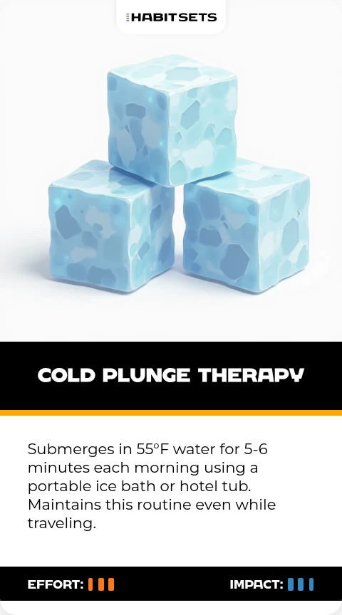 Submerges in 55°F water for 5-6 minutes each morning using a portable ice bath or hotel tub. Maintains this routine even while traveling.