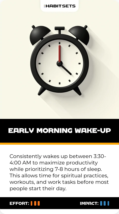 Consistently wakes up between 3:30-4:00 AM to maximize productivity while prioritizing 7-8 hours of sleep. This allows time for spiritual practices, workouts, and work tasks before most people start their day.