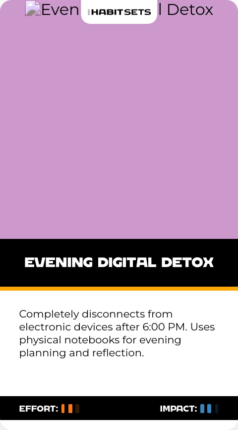 Completely disconnects from electronic devices after 6:00 PM. Uses physical notebooks for evening planning and reflection.