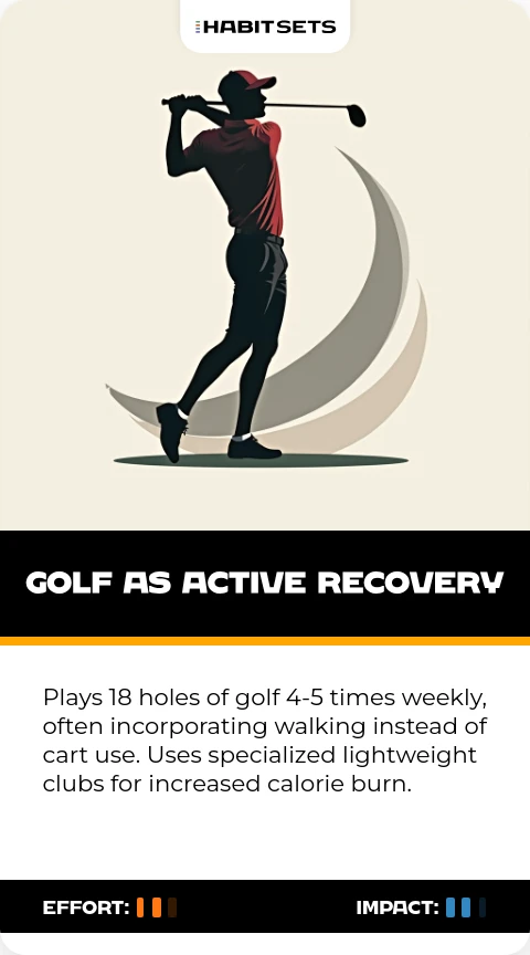 Plays 18 holes of golf 4-5 times weekly, often incorporating walking instead of cart use. Uses specialized lightweight clubs for increased calorie burn.