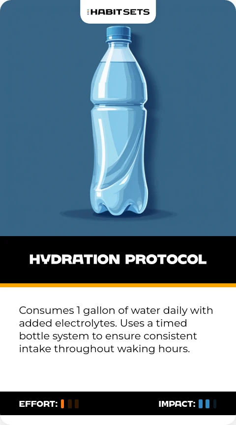 Consumes 1 gallon of water daily with added electrolytes. Uses a timed bottle system to ensure consistent intake throughout waking hours.