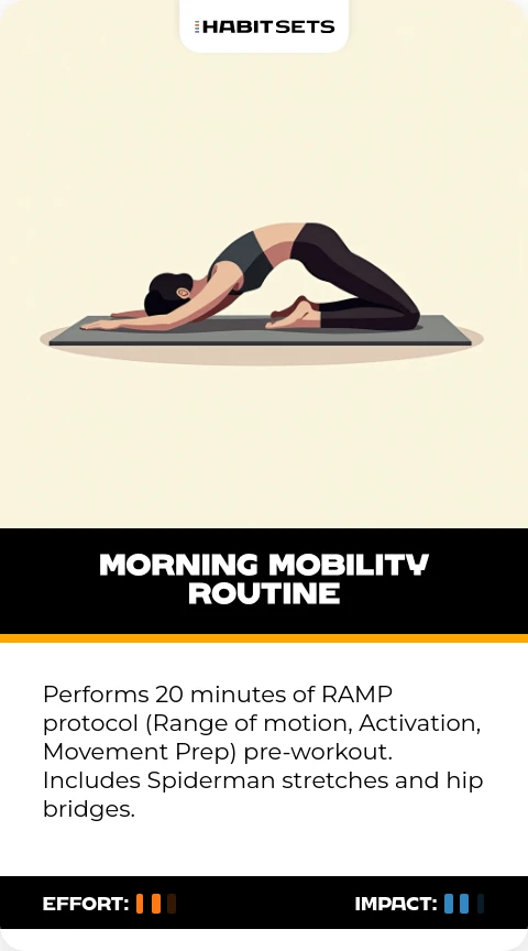 Performs 20 minutes of RAMP protocol (Range of motion, Activation, Movement Prep) pre-workout. Includes Spiderman stretches and hip bridges.
