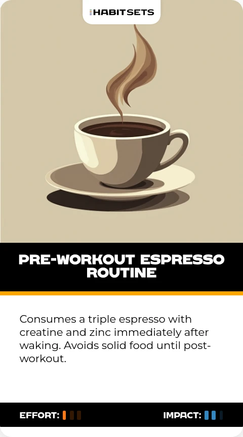 Consumes a triple espresso with creatine and zinc immediately after waking. Avoids solid food until post-workout.
