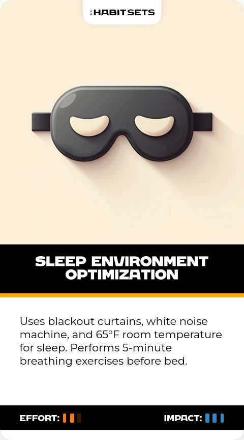 Uses blackout curtains, white noise machine, and 65°F room temperature for sleep. Performs 5-minute breathing exercises before bed.
