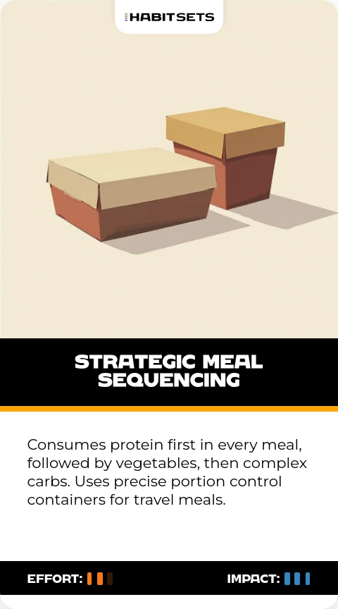 Consumes protein first in every meal, followed by vegetables, then complex carbs. Uses precise portion control containers for travel meals.