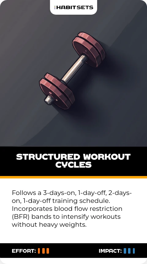 Follows a 3-days-on, 1-day-off, 2-days-on, 1-day-off training schedule. Incorporates blood flow restriction (BFR) bands to intensify workouts without heavy weights.