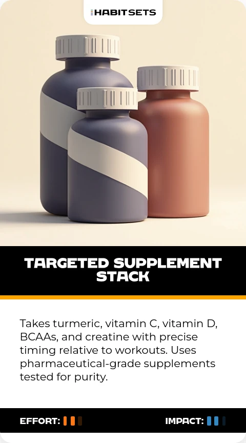 Takes turmeric, vitamin C, vitamin D, BCAAs, and creatine with precise timing relative to workouts. Uses pharmaceutical-grade supplements tested for purity.