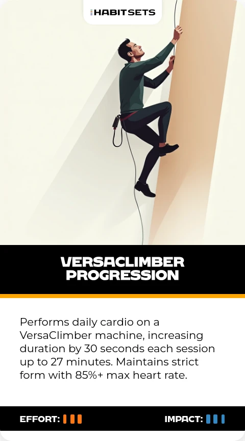 Performs daily cardio on a VersaClimber machine, increasing duration by 30 seconds each session up to 27 minutes. Maintains strict form with 85%+ max heart rate.