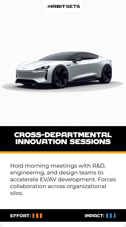 Hold morning meetings with R&D, engineering, and design teams to accelerate EV/AV development. Forces collaboration across organizational silos.
