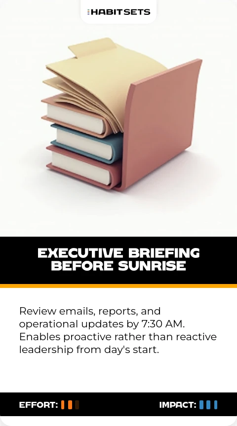 Review emails, reports, and operational updates by 7:30 AM. Enables proactive rather than reactive leadership from day's start.