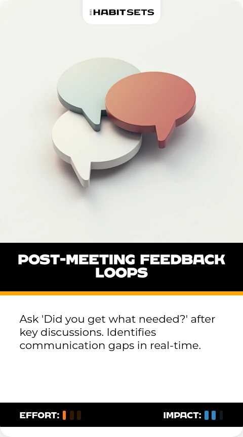 Ask 'Did you get what needed?' after key discussions. Identifies communication gaps in real-time.
