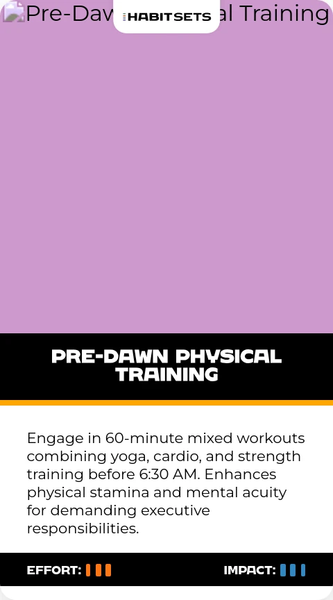 Engage in 60-minute mixed workouts combining yoga, cardio, and strength training before 6:30 AM. Enhances physical stamina and mental acuity for demanding executive responsibilities.