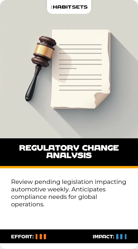 Review pending legislation impacting automotive weekly. Anticipates compliance needs for global operations.