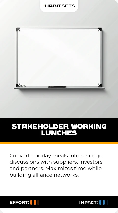 Convert midday meals into strategic discussions with suppliers, investors, and partners. Maximizes time while building alliance networks.