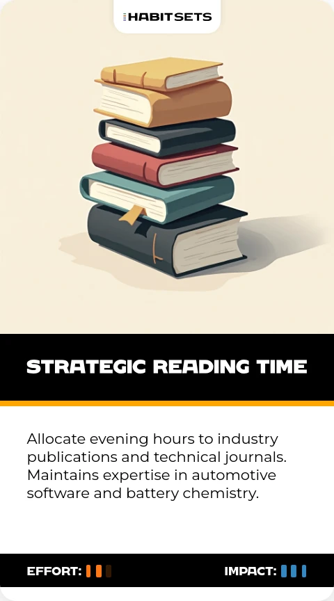 Allocate evening hours to industry publications and technical journals. Maintains expertise in automotive software and battery chemistry.