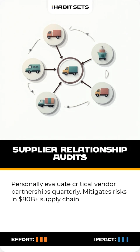 Personally evaluate critical vendor partnerships quarterly. Mitigates risks in $80B+ supply chain.