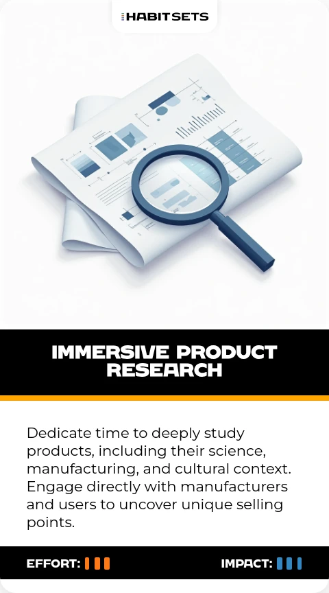 Dedicate time to deeply study products, including their science, manufacturing, and cultural context. Engage directly with manufacturers and users to uncover unique selling points.