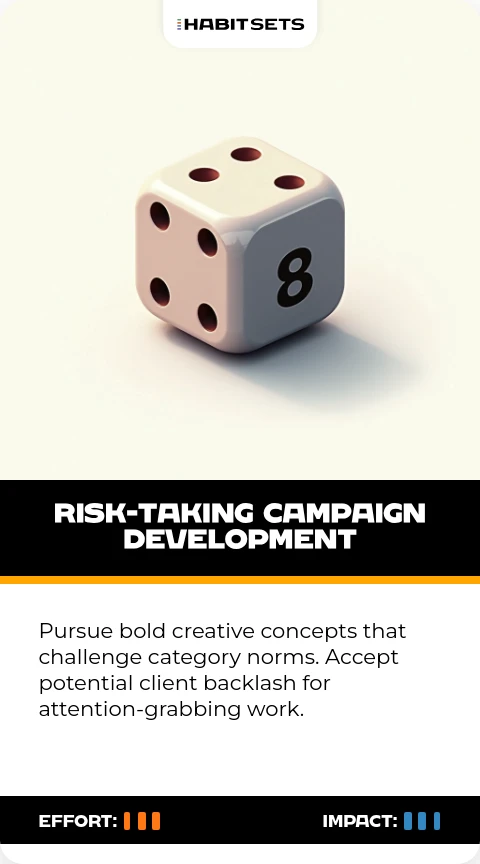 Pursue bold creative concepts that challenge category norms. Accept potential client backlash for attention-grabbing work.