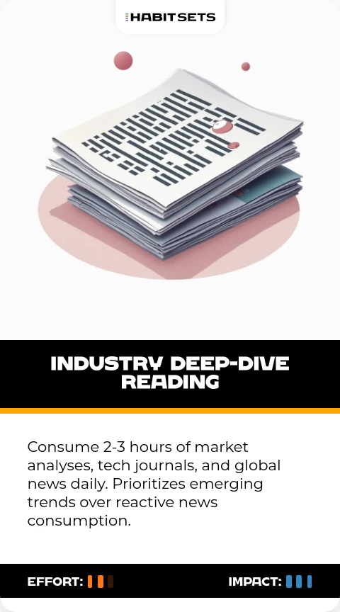 Consume 2-3 hours of market analyses, tech journals, and global news daily. Prioritizes emerging trends over reactive news consumption.