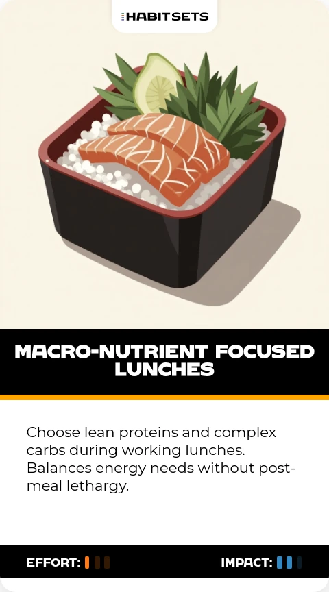Choose lean proteins and complex carbs during working lunches. Balances energy needs without post-meal lethargy.