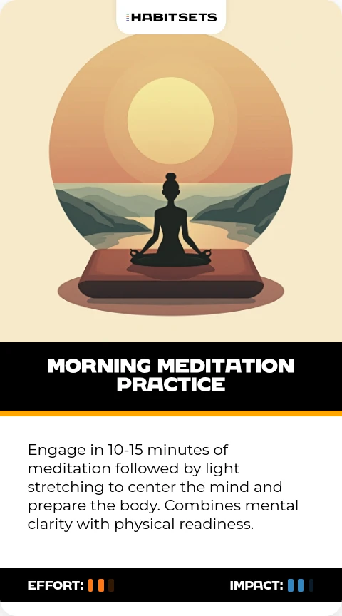 Engage in 10-15 minutes of meditation followed by light stretching to center the mind and prepare the body. Combines mental clarity with physical readiness.