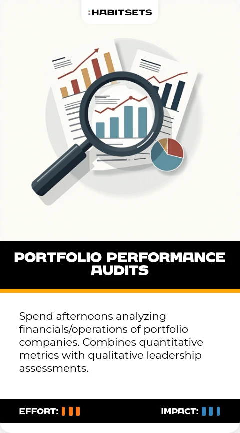 Spend afternoons analyzing financials/operations of portfolio companies. Combines quantitative metrics with qualitative leadership assessments.