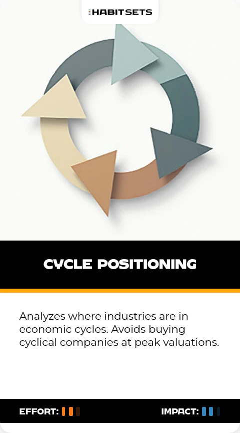 Analyzes where industries are in economic cycles. Avoids buying cyclical companies at peak valuations.
