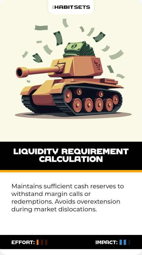 Maintains sufficient cash reserves to withstand margin calls or redemptions. Avoids overextension during market dislocations.
