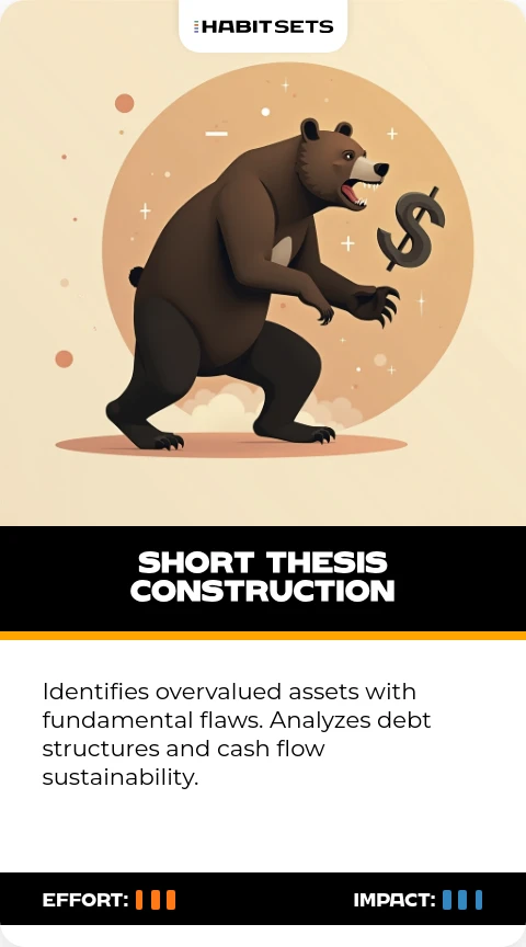 Identifies overvalued assets with fundamental flaws. Analyzes debt structures and cash flow sustainability.