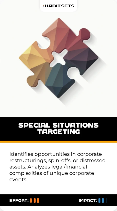 Identifies opportunities in corporate restructurings, spin-offs, or distressed assets. Analyzes legal/financial complexities of unique corporate events.