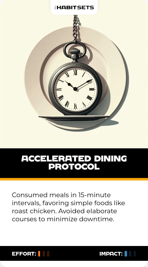 Consumed meals in 15-minute intervals, favoring simple foods like roast chicken. Avoided elaborate courses to minimize downtime.