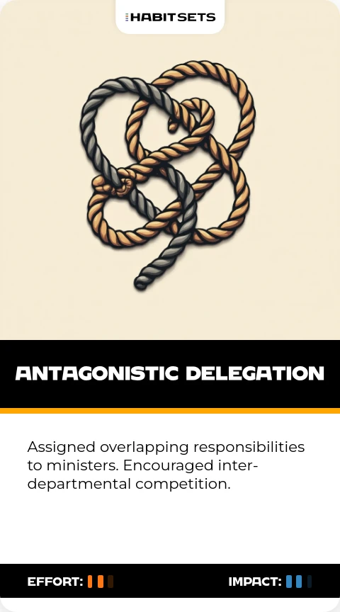 Assigned overlapping responsibilities to ministers. Encouraged inter-departmental competition.