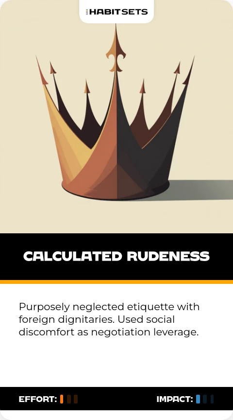 Purposely neglected etiquette with foreign dignitaries. Used social discomfort as negotiation leverage.