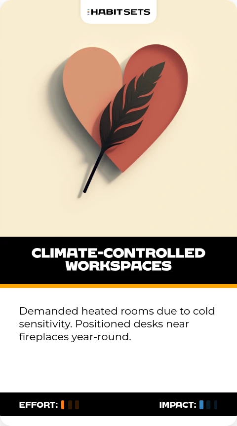 Demanded heated rooms due to cold sensitivity. Positioned desks near fireplaces year-round.