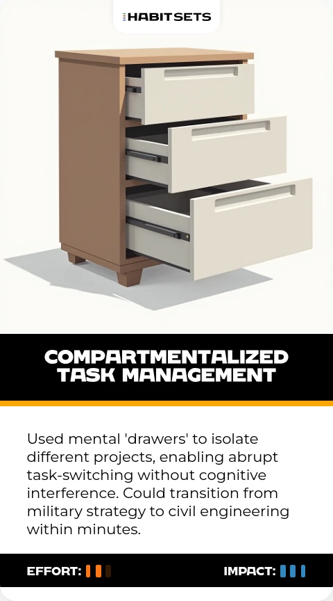 Used mental 'drawers' to isolate different projects, enabling abrupt task-switching without cognitive interference. Could transition from military strategy to civil engineering within minutes.