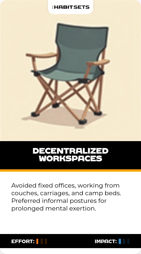 Avoided fixed offices, working from couches, carriages, and camp beds. Preferred informal postures for prolonged mental exertion.