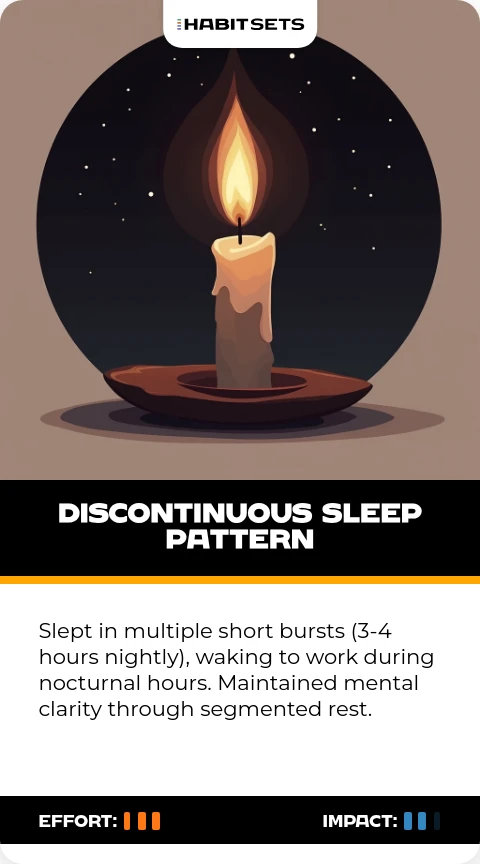 Slept in multiple short bursts (3-4 hours nightly), waking to work during nocturnal hours. Maintained mental clarity through segmented rest.