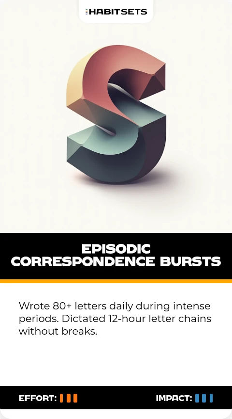 Wrote 80+ letters daily during intense periods. Dictated 12-hour letter chains without breaks.