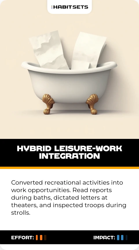 Converted recreational activities into work opportunities. Read reports during baths, dictated letters at theaters, and inspected troops during strolls.