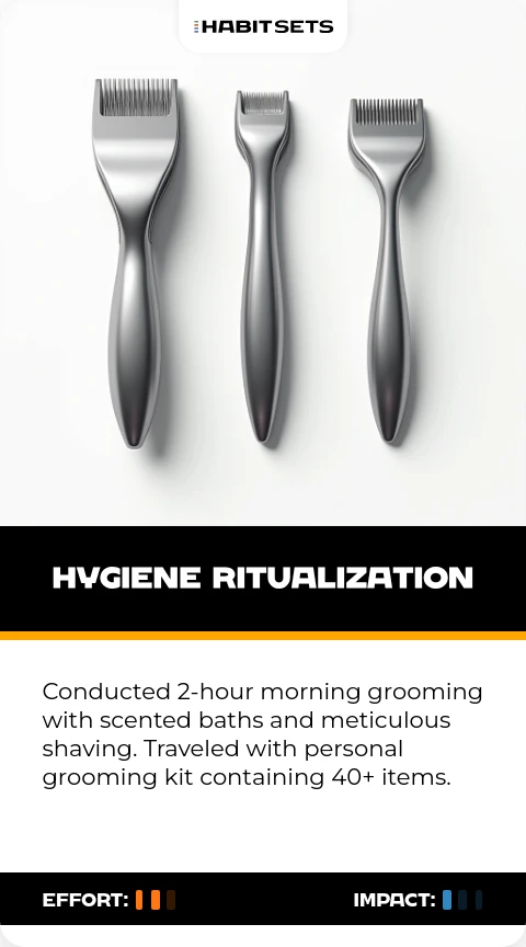 Conducted 2-hour morning grooming with scented baths and meticulous shaving. Traveled with personal grooming kit containing 40+ items.