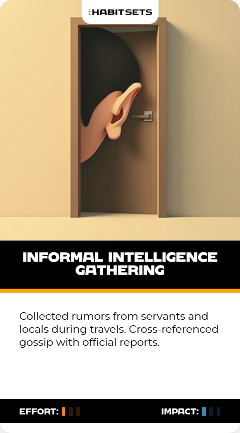 Collected rumors from servants and locals during travels. Cross-referenced gossip with official reports.