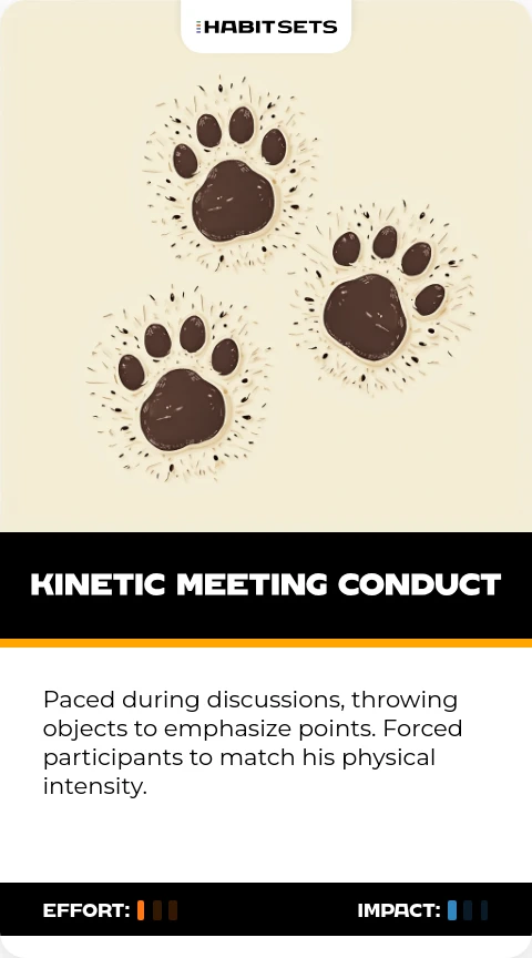 Paced during discussions, throwing objects to emphasize points. Forced participants to match his physical intensity.