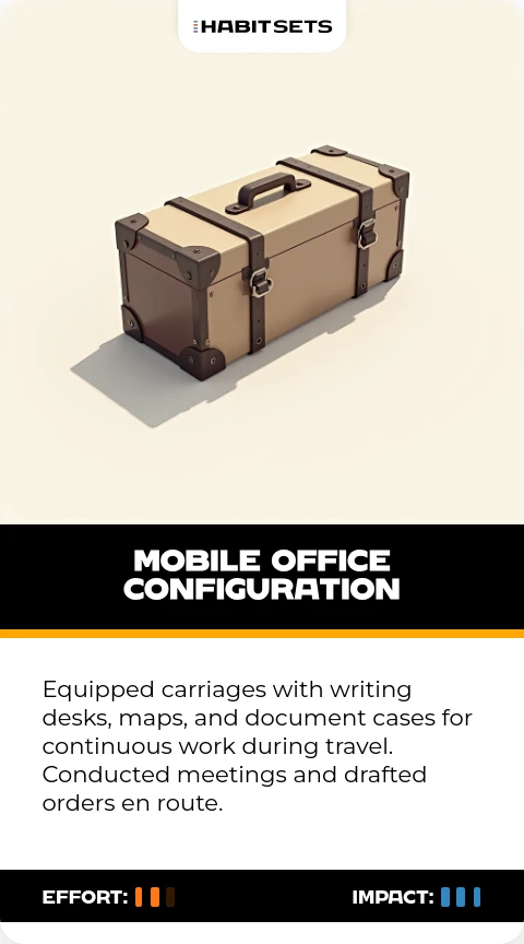 Equipped carriages with writing desks, maps, and document cases for continuous work during travel. Conducted meetings and drafted orders en route.