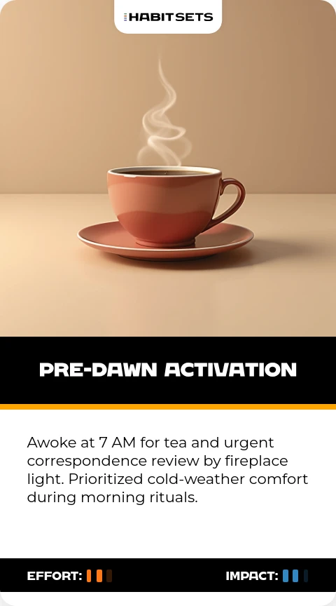 Awoke at 7 AM for tea and urgent correspondence review by fireplace light. Prioritized cold-weather comfort during morning rituals.