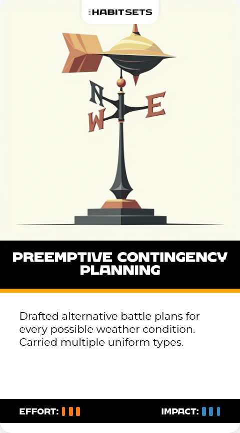Drafted alternative battle plans for every possible weather condition. Carried multiple uniform types.